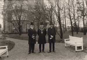 Gruppenbild anläßlich der Einweihung der "Heilstätte Seltersberg" (v. re. n. li.): Architekt Baurat Mayer, Prof. Alfred Eduard Heinrich Brüggemann und Herr Dr. h.c. Neumann, Vorsitzender der Landesversicherungsanstalt