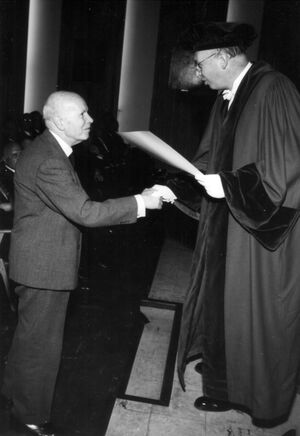 Der Dekan der Naturwissenschaftlich-Philosophischen Fakultät verleiht Peter Pringsheim die Ehrendoktorwürde