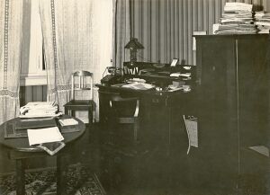 kurz nach ihrer Fertigstellung 1907, Innenansicht eines Schreib-/ Büro-Arbeitsplatzes. |