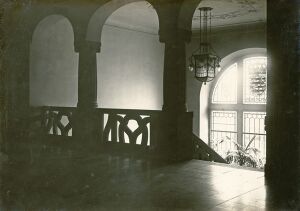 Die Chirurgische Klinik der Universität Gießen kurz nach ihrer Fertigstellung 1907, Innenansicht des Treppenhauses mit Blick auf das große Fenster über dem Haupteingang. |
