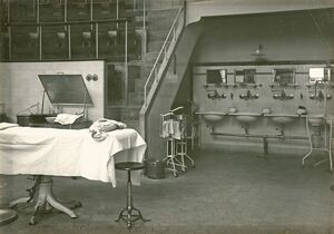 kurz nach ihrer Fertigstellung 1907, Detailansicht vom Vorführbereich im Hörsaal mit OP-Tisch und Waschbecken. |