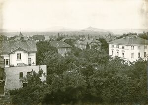 kurz nach ihrer Fertigstellung 1907, Blick von der Chirurgischen Klinik über Wohnhäuser hinweg Richtung Vetzberg (li) und Gleiberg (re) |