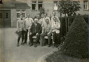 Die Chirurgische Klinik der Universität Gießen kurz nach ihrer Fertigstellung 1907, Gruppenbild mit Personal im Garten der Klinik, vorne links auf der Bank Kliniksdirektor Prof. Peter Poppert. |